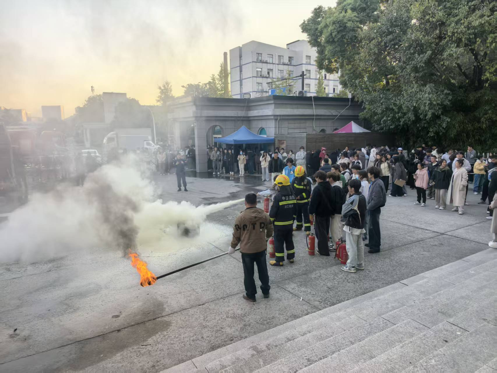 在消防器材教学环节,消防工作人员现场演示了干粉灭火器“提瓶、拔销、握管、压阀”的操作流程,并强调了“站在上风口、对准火焰根部喷射”的关键细节。通过“手把手现场教学”,让师生们对消防器材使用有了更清晰的认识。