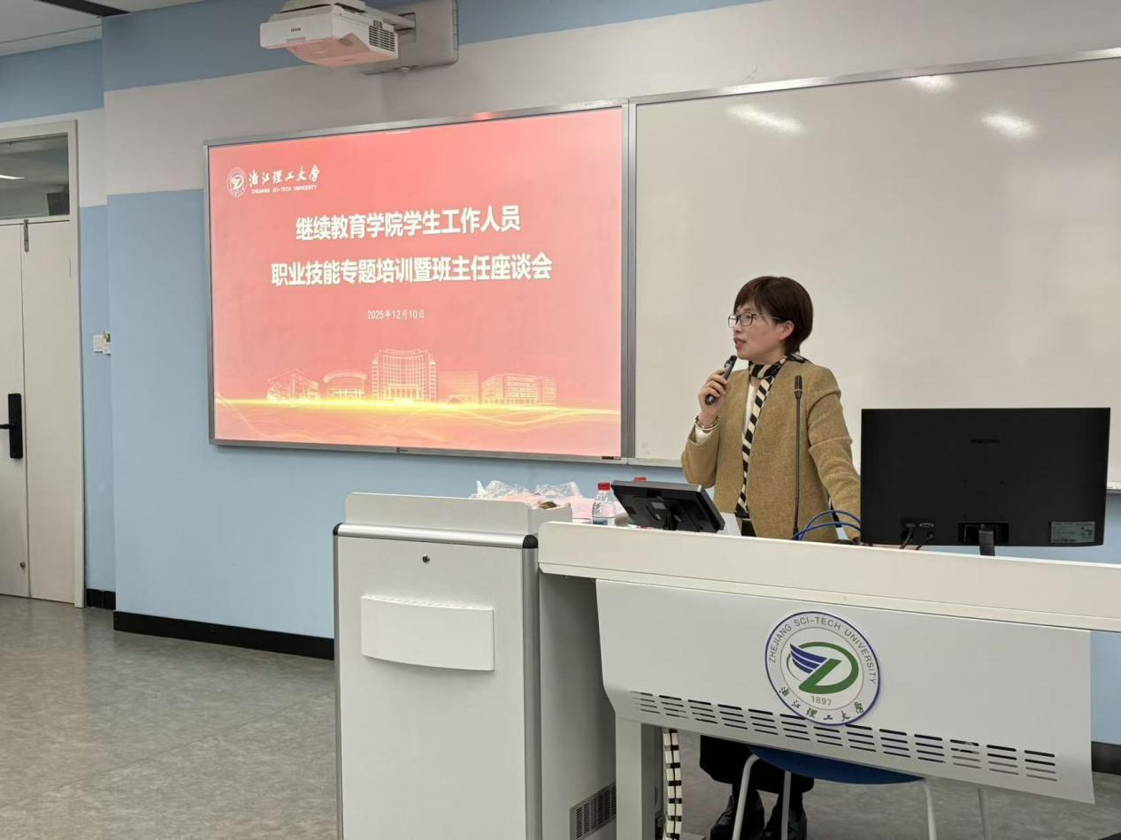为进一步提升班主任工作能力、增强育人实效,继续教育学院于12月10日举办“学生工作人员职业技能专题培训暨班主任座谈会”,特别邀请校心理健康教育中心虞雅伦老师作专题辅导。学院党委副书记楼玉兰出席会议,参加座谈会的还有学院学工办全体成员、自考全日制各助学部学生工作负责人及全体班主任。会议由学工办主任王国书主持。